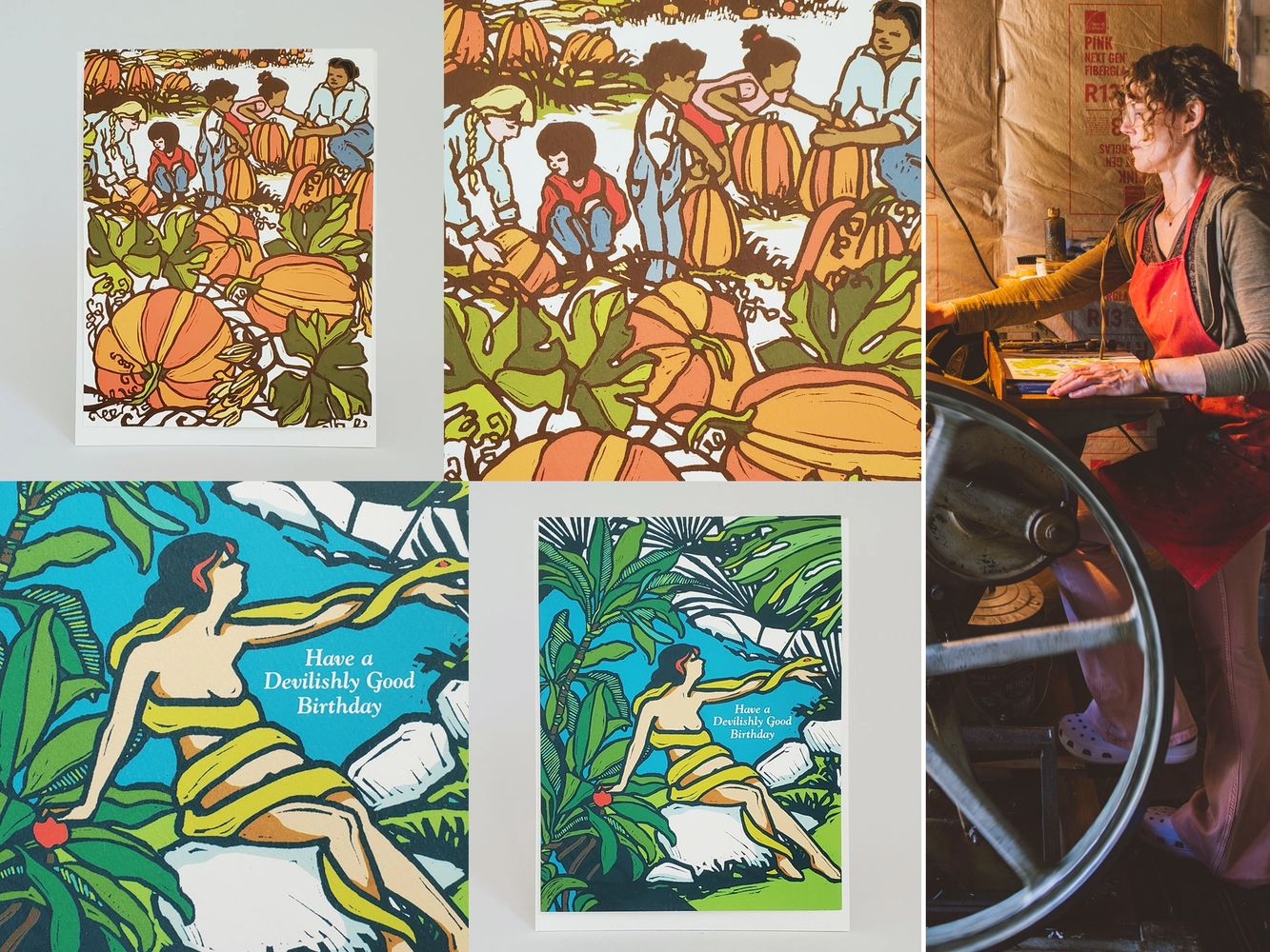 Hello! My name is Katie and I'm the artist behind the Little Green product line. All of my designs originate from fine art block prints created by hand on an antique letterpress. I'm inspired by nature and unique color combinations. I love adding small hidden details to my illustrations that tell a story.